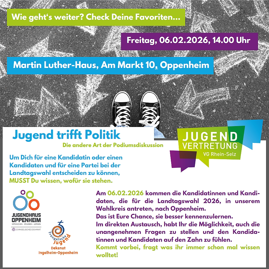 Die nächste Landtagswahl in Rheinland-Pfalz findet am Sonntag, den 22. März 2026 statt. Zu diesem Anlaß veranstaltet das Jugendhaus und die Evangelische Jugend des Dekanats Ingelheim-Oppenheim in Kooperation mit der Jugendvertretung der VG Rhein-Selz einen Jugendpolittalk unter dem Motto "Jugend trifft Politik".